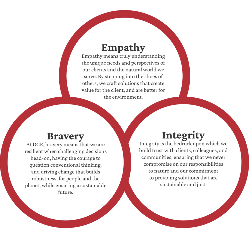 DGE Group believes that the environment and humanity are inherently interconnected, relying on each other for sustainable progress. That is why we exist: To build a more resilient world for a sustainable future beyond our own; serving our clients and partners with bravery, integrity, and empathy.